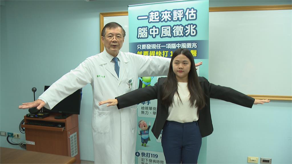 而民眾要怎麼樣知道自己或家人是不是有腦中風的情況,只要記住「微笑,舉手,說你好」三個口訣。微笑,看患者臉部表情有沒有對稱,舉手,患者雙手平舉有無對稱,最後看看患者能不能清晰的說出「你好」,一旦有出現徵兆,就要趕快打119就醫。